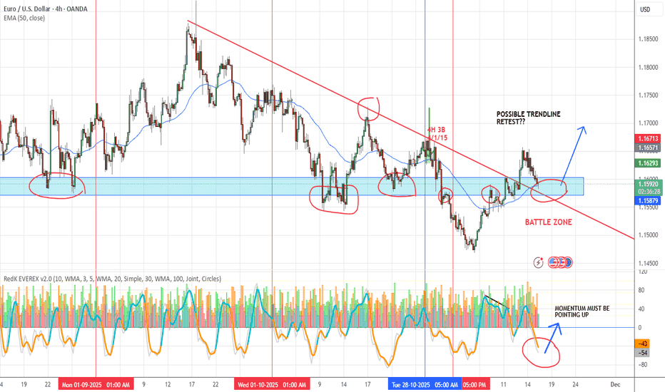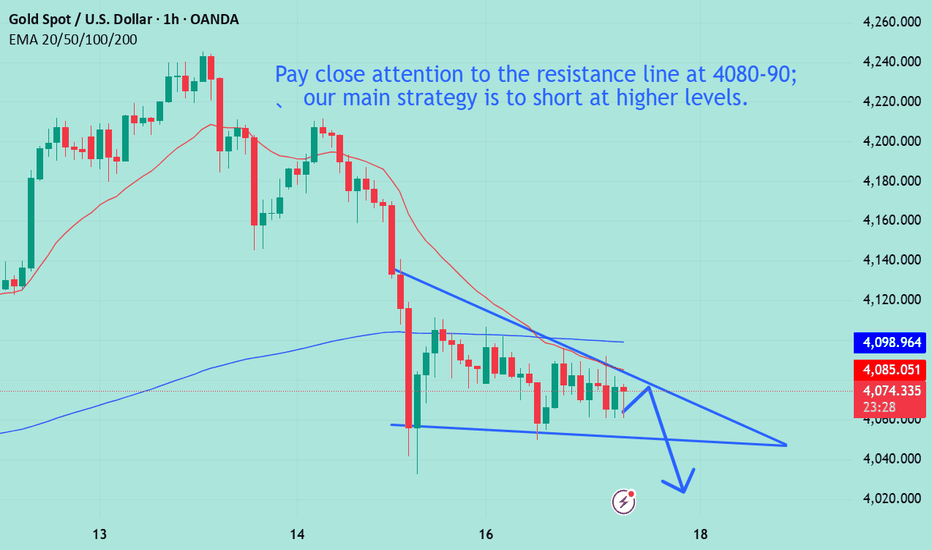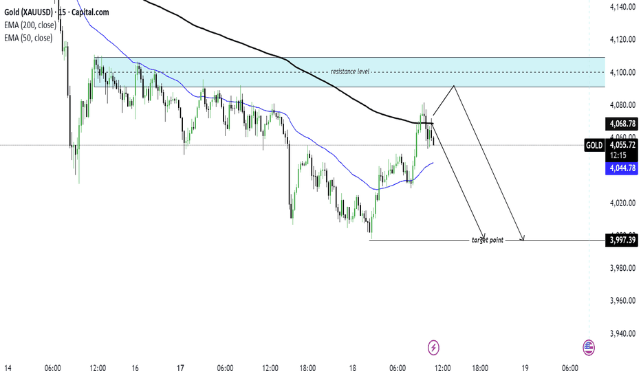EMA 50 (blue) trending below price but still pointing downward. EMA 200 (black) well above price, suggesting the overall larger trend remains bearish. A large resistance zone marked around 4,095–4,115. Price is currently around 4,060. The analyst has drawn arrows indicating a potential retracement up into the resistance zone, followed by a sell-off toward a target around 3,997. 🧠 Interpretation of the Analysis on the Chart 1. Resistance Zone The shaded blue region marks a major supply area where: Price previously consolidated Sellers dominated before pushing down This area coincides with the region where: Price might retest the 200 EMA overhead Previous structure created liquidity 2. Expected Move The arrows suggest the following scenario: Price rallies slightly higher (likely to tap the resistance zone or sweep local highs). After that, it rejects from resistance, respecting the bearish higher-timeframe direction. A continuation move leads price down to the target at around... Read more -