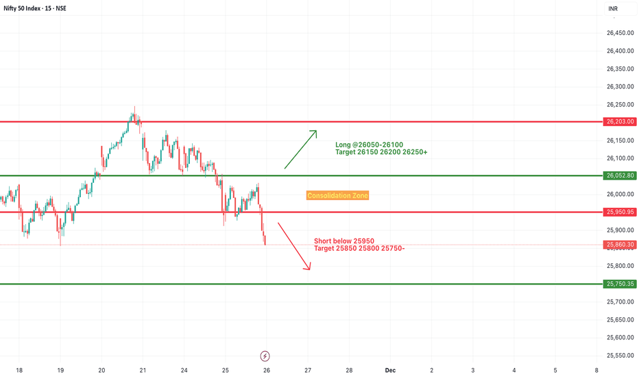 Nifty is expected to open with a gap-up today, and if the index sustains above the 26050 level, bullish momentum may continue in the early part of the session. A stable move above the 26050β26100 zone will activate the long setup with upside targets of 26150, 26200, and 26250+. If buyers remain strong, the move can further extend toward the higher resistance zone. On the downside, weakness will be confirmed only if Nifty falls below 25950, which will trigger the short setup with downside targets of 25850, 25800, and 25750-. With a gap-up opening expected above 26050, the early trend remains positive, but sustaining above the breakout zone is essential for further upside.... Read more -