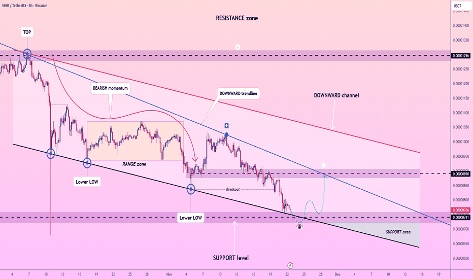BINANCE:SHIBUSDT perfectly played out my previous trading idea . Price is testing lower boundary of the descending channel. The market structure remains bearish overall, but the reaction at support hints at early absorption as the market forms yet another lower low near the key demand zone. If buyers defend the 0.00000741–0.00000767 area, a corrective bounce toward 0.00000890 becomes the likely scenario as liquidity builds beneath the trendline. The broader context still shows a controlled downtrend, but fake breaks at support often trigger short-term relief moves before the trend resumes. ⚠️ Risks: A clean breakdown below 0.00000741 may open the way toward deeper lows in the support area. Broader market weakness—especially BTC volatility—could invalidate any developing rebound. Failure to reclaim the descending trendline may limit upside movement and keep SHIB consolidating near the lows. If this idea resonates with you or you have your own opinion, traders, hit the comments. I’m... Read more -