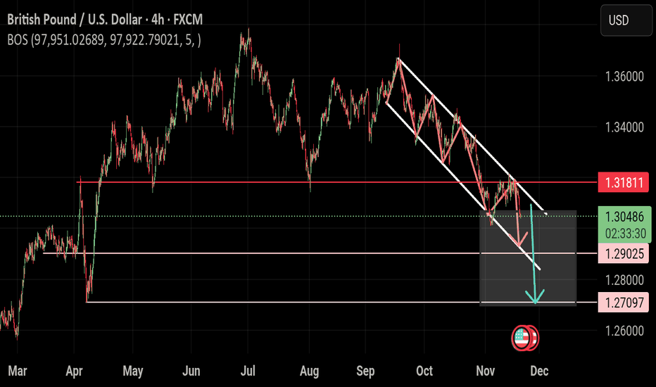 Based on the technical analysis shown in the chart, the GBP/USD currency pair is exhibiting a bearish continuation pattern known as a bear flag or downward-sloping channel following a significant drop. This typically suggests further downward movement is likely. 📉 Key Observations Trend: The pair is in a strong downtrend following a previous high. Continuation Pattern: The price action is contained within a downward-sloping channel (the two white parallel lines) which is the "flag" component of a bear flag, suggesting a temporary pause or consolidation before the downtrend resumes. * Breakout Implication: The current price is near the bottom support of this channel. A breakout below the channel's lower boundary would confirm the continuation of the downtrend. Key Support Levels: The chart highlights potential downside targets: 1.29025 1.28000 1.27097 (This appears to be the primary support target based on the channel's projected decline, possibly derived from the "pole" measurement of... Read more -