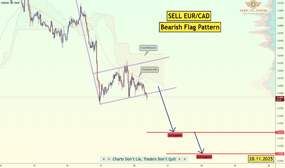 🧠 Setup Overview TICKMILL:EURCAD EUR/CAD is forming a clean Bearish Flag Pattern after a strong impulsive drop. Price is trading below the EMA, inside a rising corrective channel — a classic continuation structure. With cloud resistance above and repeated rejections from the upper flag boundary, bearish momentum is building. A confirmed breakdown below the lower trendline could trigger the next bearish leg. 📊 Trading Plan🔻 Sell Bias (Primary Scenario) Watch for a candle break & retest below the flag Enter short after confirmation 🎯 Targets: 1st Support: 1.6137 2nd Support: 1.6109 ❌ Invalidation: A strong candle close above 1.6230 cancels the bearish view ⚡ Fundamental Outlook – Today (20 Nov 2025) CAD Fundamentals 1️⃣ Canadian Dollar strengthened as crude oil prices saw a mild rebound, supporting CAD (commodity-linked currency). 2️⃣ Bank of Canada remains cautious, but no new signs of easing have emerged — giving CAD some underlying firmness. EUR... Read more -
