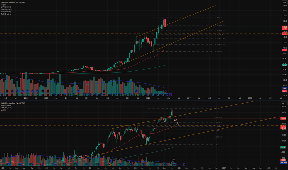 Nvidia remains in a broader uptrend, but the chart shows a clear trendline breakout followed by the beginning of a pullback. Using Fibonacci, a correction typically starts after a red candle forms following a sequence of green candles. In most cases, the pullback continues toward the 0.5 retracement level. In this setup, the 0.5 level aligns with a major key support, increasing its importance. On the weekly timeframe, the 50 EMA is also converging at the same zone, which often acts like a magnet for price. This creates multiple confirmations pointing toward a potential move downward. The weekly chart has printed a bearish engulfing , followed by three consecutive red candles, adding another strong confirmation for a continued correction. Both MACD and RSI are sloping downward, supporting the bearish momentum. If price reaches the expected zone, monitoring the reaction will be critical. A deeper decline into the global trendline is... Read more -
