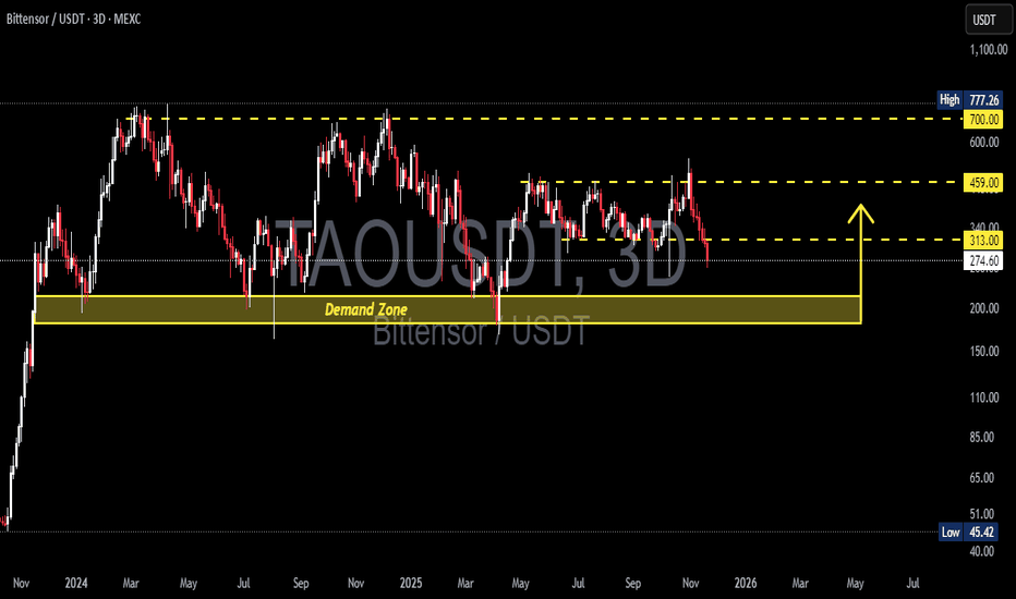 TAO is entering one of the most decisive moments in its multi-month structure. After losing its mid-range support and gradually sliding lower, the price is now approaching the same demand zone that has repeatedly launched strong macro rallies since 2024 — the 215–180 zone. This zone is not just another support level. It is a “liquidity engine” where institutions, swing traders, and smart money previously stepped in aggressively, triggering explosive recoveries back toward major resistances (459 → 700 → 777). Now, the market is once again descending into this energy zone. The question is: Will TAO bounce one more time, or will this be the first decisive breakdown that shifts the entire macro structure? --- Market Structure & Price Pattern Macro range has dominated since 2024 → alternating phases of accumulation and distribution. Repeated rejections near 700–777 signal a strong supply ceiling. Lower highs in recent swings indicate sustained short-term... Read more -