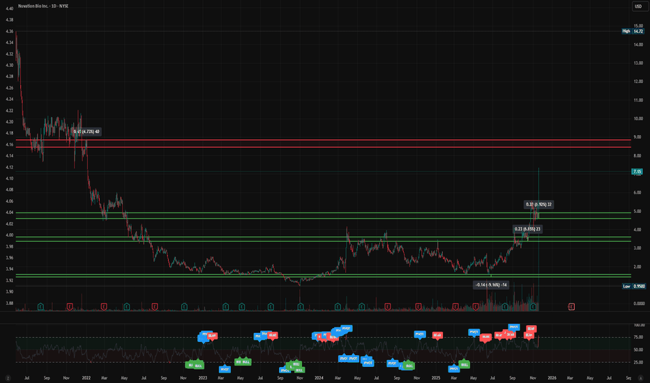 NYSE:NUVB just delivered one of its biggest breakout moves of the year — ripping from the mid-$3 range into the $7s in a single vertical expansion candle. This move cleared months of consolidation and broke straight through multiple resistance layers, signaling a major shift in momentum. With volume spiking to near multi-year highs, NYSE:NUVB is now setting up for potential continuation into the next structural targets above. The chart now sits above all local supply zones — the first time since early 2022 — suggesting this breakout may have legs if bulls maintain control. 📊 Technical Overview Support Levels: $5.35 → $4.75 → $4.05 Resistance Levels: $7.15 (current) → $8.50 → $10.45 (multi-year high) Structure: Long-term base breakout after multi-year downtrend & accumulation Momentum: RSI extended but trending strongly; breakout volume highest in years Trend Bias: Ultra-bullish above $5.35 As long as NYSE:NUVB holds above $5.35, this breakout remains valid.... Read more -