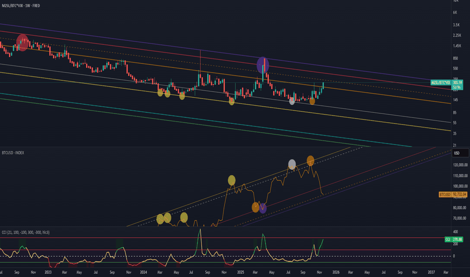It shows the ratio of global liquidity (M2) to Bitcoin’s market capitalization, amplified by market fear (VIX), relative to BTCUSD. Thanks to this formula, we have an understanding of which phase of the market we are currently in. In this case the CCI indicator shows: overbought conditions — meaning money is outside the market and oversold conditions — meaning there is too much money in the market and it’s time to sell FRED:M2SL/CRYPTOCAP:BTC*TVC:VIX For some reason the Bitcoin chart isn’t displaying with all the markings, so I’ll attach a screenshot below.... Read more -