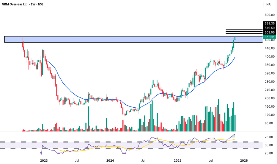 STRONG BUY Setup 🌾Entry: ₹494-500 (Current Level) Target 1: ₹509-515 Target 2: ₹519-525 Target 3: ₹528-540 Target 4: ₹560-580+ (Extended Breakout Target) Stop Loss: ₹480Technical Rationale: EXPLOSIVE BREAKOUT from multi-year resistance at 480 (blue horizontal line at top) Massive +2.83% surge on weekly chart with strong momentum Breaking above 2-year consolidation/resistance zone (highlighted "1d 19h" in green) Volume at 3.23M - strong for weekly timeframe confirming breakout Weekly chart showing major pattern completion Trading well above rising EMA (blue curve) - strong bullish trend RSI trending upward around 70-75 - strong momentum Basmati rice exporter - agri-commodity play with export potential Multiple resistance levels clearly marked: 509, 519, 528 Clear support established at breakout zone 480 Strong recovery from 2023-2024 lows (~160) to current levels Pattern shows consistent higher highs and higher lows since mid-2024 Breaking into new all-time high territory Risk-Reward: Excellent 1:4 to 1:6+ ratio for extended targetsPattern:... Read more -