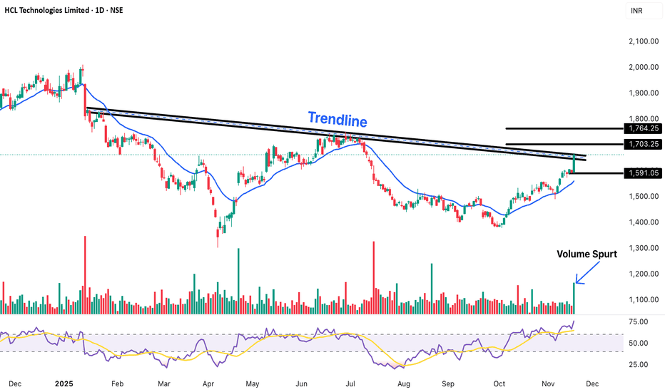 STRONG BUY Setup 💻 Entry: ₹1,662-1,675 (Current Level) Target 1: ₹1,703-1,720 Target 2: ₹1,764-1,780 Target 3: ₹1,820-1,850 Target 4: ₹1,900-1,950+ (Extended - Trendline Breakout Target) Stop Loss: ₹1,591Technical Rationale: BREAKING ABOVE year-long descending trendline (marked "Trendline" in blue on chart) Explosive +4.23% surge with exceptional volume spike (6.34M - highlighted as "Volume Spurt") Daily chart showing decisive breakout from long-term resistance Trading well above rising EMA (blue curve) - strong bullish reversal Volume is highest in months (marked with blue arrow) - institutional buying confirmed RSI trending strongly upward around 70-75 - powerful momentum IT Services sector leader - one of India's top IT companies Multiple resistance levels clearly mapped: 1,703, 1,764 Strong support established at breakout zone 1,591-1,600 Previous consolidation near 1,500-1,600 now acting as strong base Pattern shows consistent recovery from October 2025 lows Breaking above the descending channel that dominated 2025 Risk-Reward: Excellent 1:3 to 1:5+ ratio... Read more