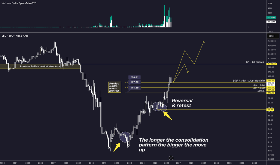 https://www.tradingview.com/x/as9asWoh/ https://www.tradingview.com/x/8Brva7JJ/ https://www.tradingview.com/x/H9QcQEI9/ LEU Volatility Expansion Thesis LEU is moving through a large volatility expansion cycle that began after a multi-year consolidation base. The initial breakout confirmed the shift in long-term trend, but the current pullback has pushed price back into key expansion levels across the 1D and 3D timeframes. These levels act as the reset zone before any continuation can occur. Short-term structure remains bearish. The 1D and 3D charts both show lower highs, lower lows, and declining momentum. Volume Delta on the 3D timeframe continues to lean negative, confirming that buyers have not taken control of the pullback. Until these signals shift, the market is still in a consolidation phase rather than the next leg higher. The main objective is a full reclaim of the 50D 1.168 level near 256 to 260. That level acted as the pivot that launched the previous expansion leg, and regaining it would... Read more -