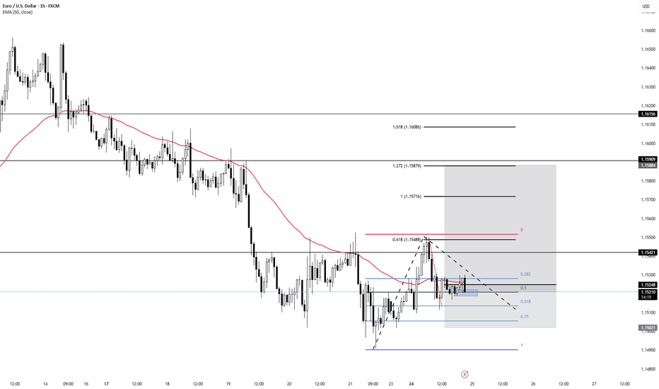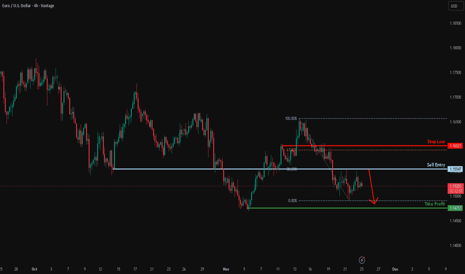 EUR/USD has rejected off the resistance level which is an overlap resistance that aligns with the 38.2% Fibonacci retracement and could drop from this level to our take profit. Entry: 1.1554 Why we like it: There is an overlap resistance level that aligns with the 38.2% Fibonacci retracement. Stop loss: 1.1602 Why we like it: There a pullback resistance that is slightly above the 61.8% Fibonacci retracement. Take profit: 1.1475 Why we like it: There is a swing low support. Enjoying your TradingView experience? Review us! Please be advised that the information presented on TradingView is provided to Vantage (‘Vantage Global Limited’, ‘we’) by a third-party provider (‘Everest Fortune Group’). Please be reminded that you are solely responsible for the trading decisions on your account. There is a very high degree of risk involved in trading. Any information and/or content is intended entirely for research, educational and informational purposes only... Read more -