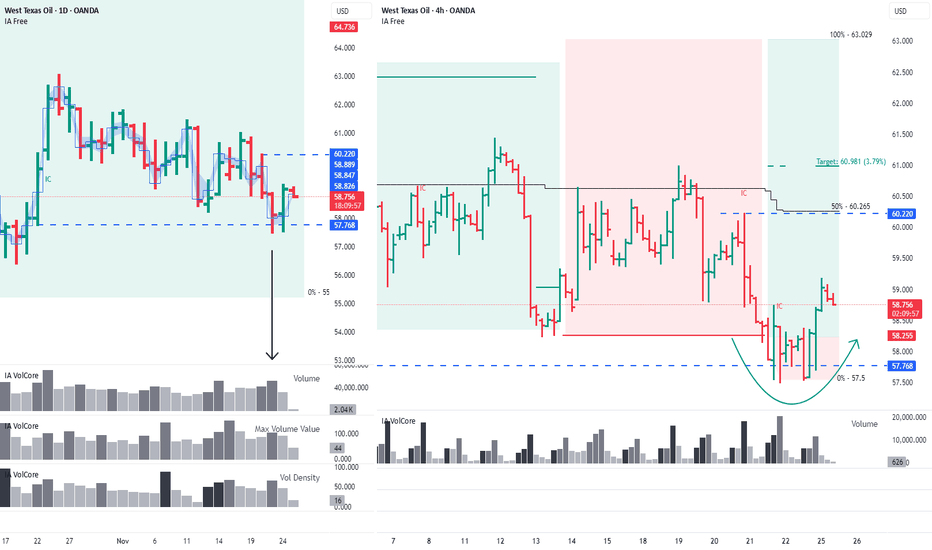 On the daily timeframe, buyers absorbed the sellers, and a false-breakout pattern has formed on the 4H chart. The nearest targets are 60.22 and 60.981. This analysis is based on the Initiative Analysis (IA) method. Hello, traders and investors! Oil is showing early signs of recovery. On the daily timeframe, the key level is 57.768 — the base of a buyer candle with increased volume during the last upward impulse. A high-volume seller candle interacted with this level, and yesterday’s daily buyer candle absorbed the seller, indicating strengthening buyer initiative. It’s also worth noting that in both candles, the key volume was accumulated at the bottom. The blue band on the chart represents the minimal price range of the candle where 50% of the volume was accumulated. The blue line marks the price level with the maximum accumulated volume. On the 4-hour timeframe, the price is in a sideways range.... Read more -
