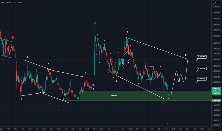 Shiba Inu is completing a very large correction across higher degrees and larger time frames. It appears to be in a double or multiple correction, currently in the second phase. This phase itself is a complex correction, and it is now finishing wave C of this complex corrective structure. The green zone is where Shiba can enter wave D in the higher time frames | a bullish wave. Remember, we do not make decisions based on emotions; we analyze based on signals and indications. For risk management, please don't forget stop loss and capital management When we reach the first target, save some profit and then change the stop to entry Comment if you have any questions Thank You... Read more -