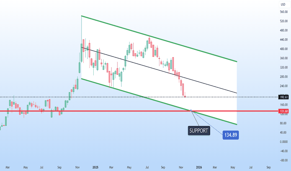 Strategy NASDAQ:MSTR is sliding deeper inside its descending channel, drifting toward a heavyweight support zone near 134–135. Price isn’t touching the channel bottom yet, but the structure is clearly guiding it toward that confluence level where major reactions tend to happen. This support has history. It’s been a battleground before, and it could become the line where momentum flips once again. If buyers step in as price approaches that zone, it could set the stage for a powerful reversal.... Read more -