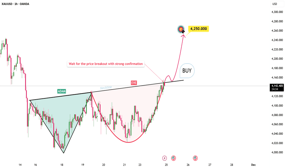 OANDA:XAUUSD is really interesting right now. The price seems likely to rise further after the formation of the Adam & Eve pattern. With such an easy-to-remember name, the Adam & Eve pattern is one of the most memorable. I will explain below the reasons and how to recognize it easily. The Adam pattern is characterized by a sharp drop, followed by a quick recovery, forming a "V" on the chart. High, sharp, and aggressive! One could say it's more "masculine." On the other hand, the Eve pattern develops more slowly. The price becomes more rounded, forming a wider and smoother base before rising again, creating a shape similar to the letter "U." Softer, more curved, and more "feminine." Combining these two elements gives us the Adam & Eve pattern, which often signals a potential trend reversal. Especially when accompanied by fundamental analysis or other strong technical indicators. This pattern will... Read more -