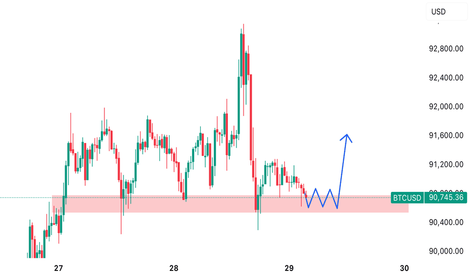 The chart shows BTC/USD on a short-term timeframe. Price is currently trading around $90,813, sitting inside a highlighted support zone (the pink area), which spans roughly $90,400 – $90,900. You’ve drawn a blue zig-zag line, indicating expected consolidation inside the support zone, followed by a bullish move upward toward the $91,600+ area... Read more -