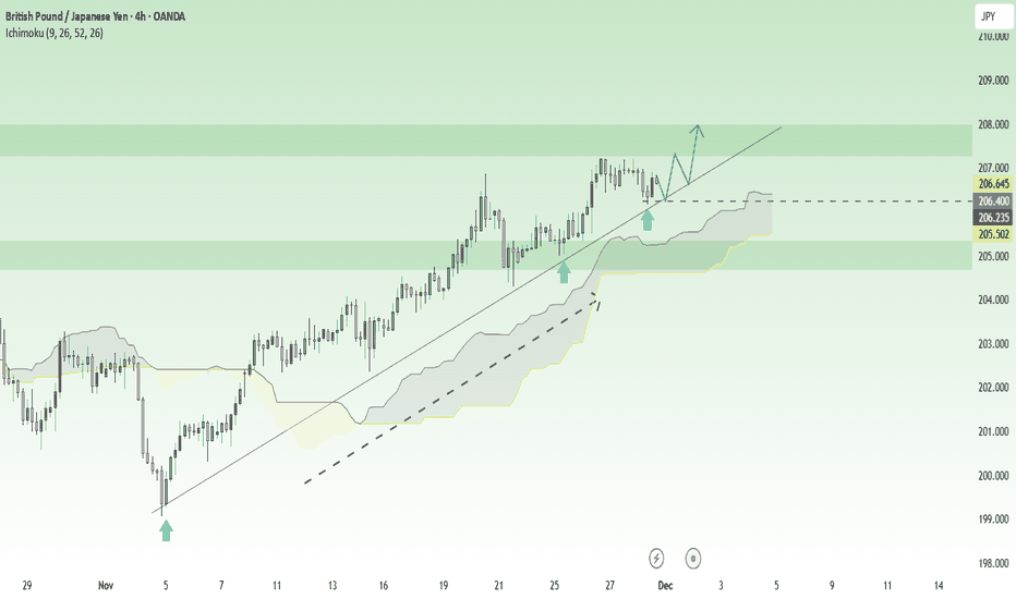 GBP/JPY is currently showing a mild uptrend, supported by both macroeconomic and technical factors. With expectations that the Fed will lower interest rates in the near future, the low-interest-rate environment is helping GBP strengthen against JPY. The Japanese yen remains weak due to BoJ's easing policy , providing an opportunity for GBP/JPY to continue its upward move. On the H4 chart, GBP/JPY is following a steady uptrend, supported by a solid trendline. The Ichimoku cloud also supports this trend, with the price consistently staying above the cloud , reinforcing the upward momentum. In the short term, if 205.50 holds, GBP/JPY could continue to target the 206.20–206.40 range. However, the strong resistance at 208.00 should be monitored if the price continues its upward move. In summary, the mild uptrend is expected to persist in the short term, with opportunities to buy on slight corrections , but it's important to pay attention... Read more -