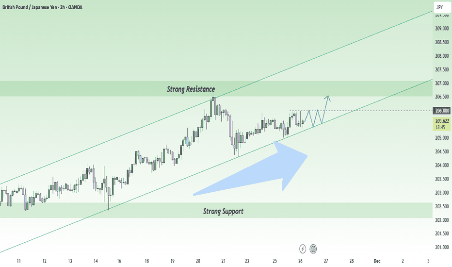 The GBP/JPY chart shows a clear bullish structure with strong buying momentum being sustained. Since November 21, 2025, the price has stayed above the upward trendline , continuing to form higher lows and higher highs. The strong support zone is around 205.100, while the main resistance is at approximately 206.500. Buy signals: Upward trendline: The trendline provides a strong foundation for the next movement. Lower timeframes: The 2-hour and 1-hour timeframes show strong buying pressure, confirming the bullish trend and the strong rebound after testing the support zone. Next scenario: With the current price at 205.500 and approaching 205.900, GBP/JPY may continue to target 206.500 in the short term. If it maintains above the support zones and continues receiving buying pressure, GBP/JPY is likely to break through resistance levels and extend its bullish trend. Outlook: The current bullish trend, supported by the strong demand zone and confirmed by lower timeframes,... Read more -