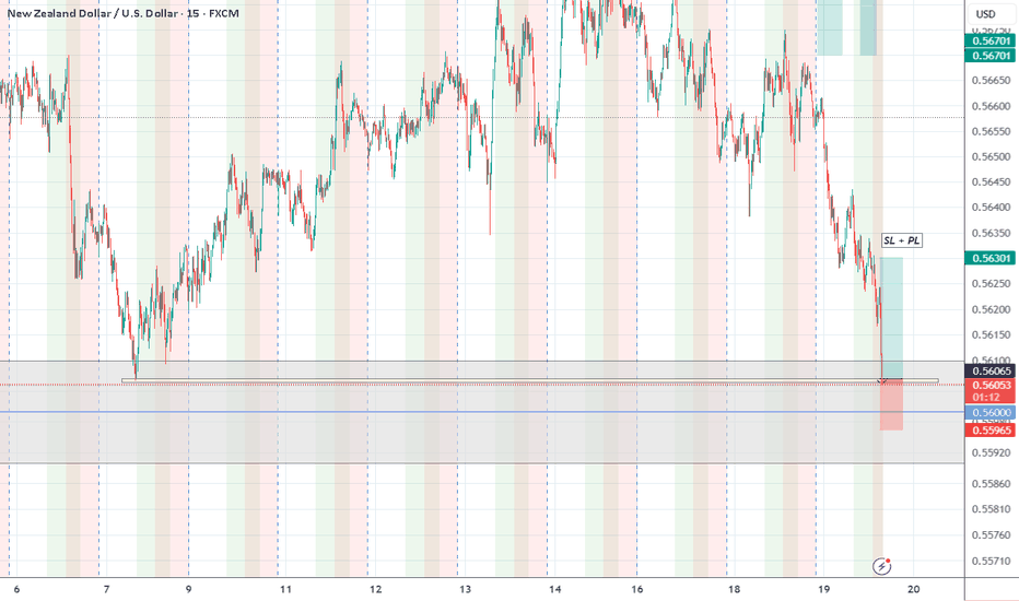 The 15-minute NZD/USD chart shows a bearish sentiment, with price tapping into the session low and P-line zone. This level acts as strong support, increasing the likelihood of a short-term bounce toward the take-profit side. With a 1-hour CAP confirmation in place, the expectation of a bounce strengthens. Although the broader structure remains bearish, the reaction from this low signals a probable corrective move upward before the wider downtrend resumes.... Read more -