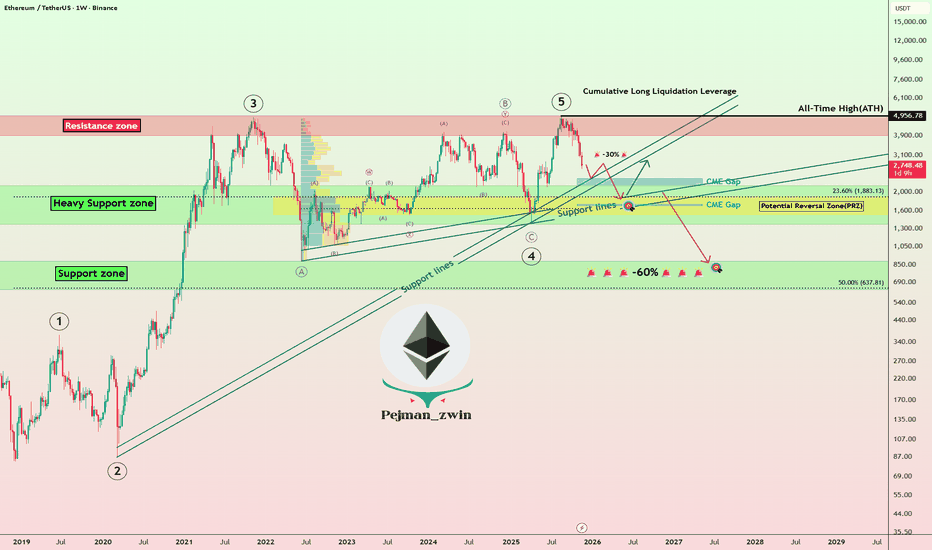 Today, I’d like to dive into an analysis of Ethereum ( BINANCE:ETHUSDT ). Given that over 80% of tokens in the crypto market are built on the Ethereum blockchain, Ethereum’s performance can serve as a roadmap for other tokens on the network. So, stay tuned! In recent times, Ethereum hasn’t been able to keep pace with Bitcoin’s growth and struggled to set a new All-Time High(ATH=$4,956). After Bitcoin’s decline, Ethereum also started to drop and is currently moving near the Heavy Support zone($2,160-$1,370), Support lines, Cumulative Long Liquidation Leverage($1,745-$1,629), and Potential Reversal Zone(PRZ) . From an Elliott Wave perspective, it seems that Ethereum has completed its main five-wave impulsive. This suggests that we might now be entering a corrective phase. The extent of this correction will depend on multiple factors, and technical analysis alone won’t predict the exact magnitude of Ethereum’s decline in the coming days or weeks. Nonetheless, I’ll... Read more -
