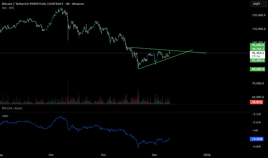 ✅ 1. Measure the triangle height A symmetrical triangle target = Height of the widest part of the triangle → projected from breakout point From your chart: Top of triangle: ≈ 96,600 USDT Bottom of triangle: ≈ 80,600 USDT Height = 96,600 – 80,600 ≈ 16,000 So the measured move is ~$16,000. 📈 2. Bullish breakout target Breakout area looks around 92,000–94,000 depending on how you anchor it. Using 93,000 as midpoint breakout zone: Bullish target = 93,000 + 16,000 = 109,000 USDT Bullish target range: ➡️ 108,000 – 110,000 USDT This lines up with the psychological 110K zone, which would likely create resistance. 📉 3. Bearish breakdown target Breakdown would occur near 88,000–90,000 depending on exact slope. Using ~89,000 as average: Bearish target = 89,000 − 16,000 = 73,000 USDT Bearish target range: ➡️ 72,000 – 74,000 USDT This also lines up with the major liquidity zone around 72K–74K.... Read more -