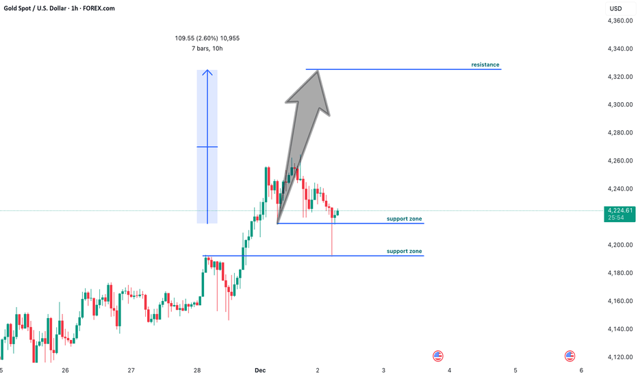 GOLD (1H) – Bullish Continuation Above Support | Premium Market Structure Gold delivered a strong impulsive rally and is now holding elegantly above a clean support zone. Price behaviour suggests controlled accumulation, with buyers defending structure after the expansion. Key Zones Support Zone 1: 4210–4220 Support Zone 2: 4175–4185 Resistance: 4335–4340 Market Structure The current retracement remains shallow, maintaining higher-low structure. Price has reacted exactly at the first support zone, signalling strength. A sustained break above 4240 may open room for a continuation into the 4330+ resistance band. Bias 📈 Bullish as long as 4210 holds. Liquidity is still intact and orderflow favours another leg higher. Potential Setup (Not Financial Advice) Entry Zone: 4215–4230 Targets: 4310 / 4335 Invalidation: Below 4175 Summary Gold retains a premium bullish structure. Support is respected, liquidity protected, and continuation potential remains high unless deeper displacement occurs. Disclaimer: Educational analysis only.... Read more -