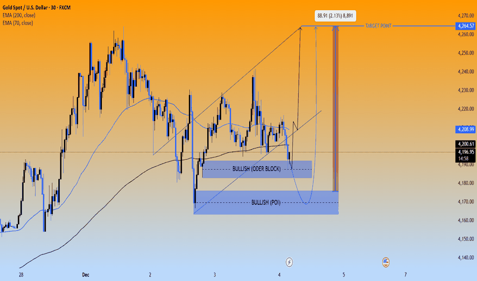 Chart Analysis (Gold – 30m) Trend Structure: Price is currently in a corrective down-move inside a rising channel, but overall structure still respects higher-timeframe bullish momentum. 🔵 Key Zones Bullish POI (Demand Zone): Lower blue zone – strong reaction point from previous impulsive move. Bullish Order Block: Upper blue zone – price is retesting this area for liquidity collection. 📈 Indicators Used EMA 70 & EMA 200: Price is oscillating between both EMAs. EMA 70 above EMA 200 → bullish bias still intact. Liquidity Sweep: Wick rejections below structure indicate liquidity grab before bullish reaction. 📌 Market Behavior Price is expected to dip into POI to collect liquidity. From POI, a bullish reversal is projected toward target zone 4,264.57. 🎯 Target 4,264.57 (Highlighted target level; aligns with channel top + liquidity zone) 📊 Summary Signal Price likely retraces into the Bullish POI, then forms a strong bullish impulse toward the... Read more -