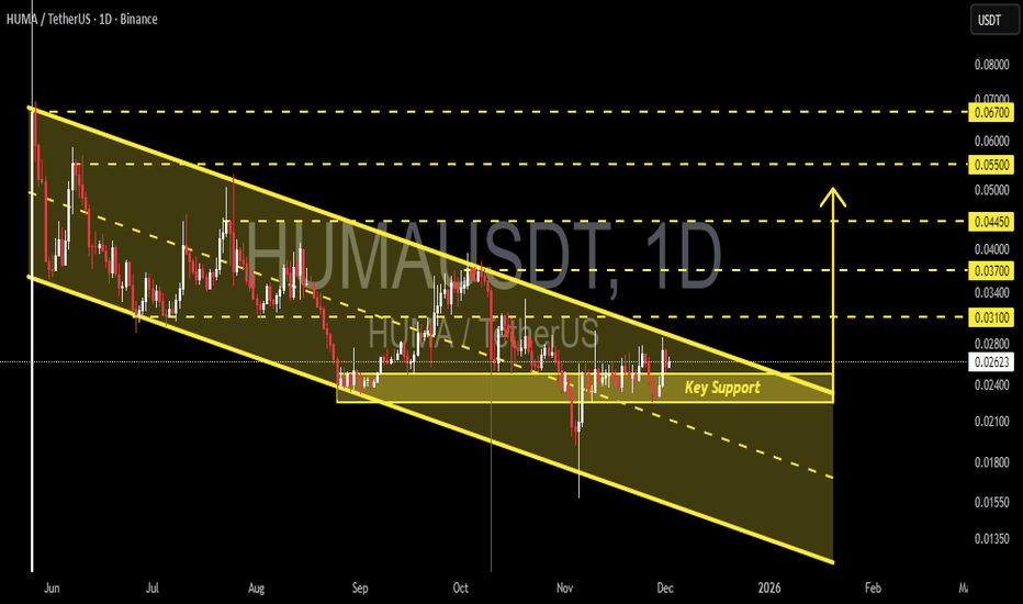 HUMA has been moving inside a large Descending Channel for months, forming a repeated yet controlled pattern of selling pressure. Every rally has consistently failed to break the upper trendline, maintaining a strong lower-high structure. But now, something important is happening: 👉 Price is sitting directly above the Key Support at 0.025–0.0225, a long-standing “life-or-death” zone for buyers. This is not just another support — this is the final defense before a major structural breakdown or a powerful market reversal. --- 🔶 Clear Technical Structure 1. Descending Channel (Major Trend) The trend remains bearish, but the channel is tightening — an early sign of momentum shift. 2. Key Support Box (0.025–0.0225) This zone has acted as a strong demand area multiple times. The more it gets tested, the bigger the potential move — either a breakout upward or a sharp breakdown. 3. Midline Reaction Price frequently reacts around the midline,... Read more -