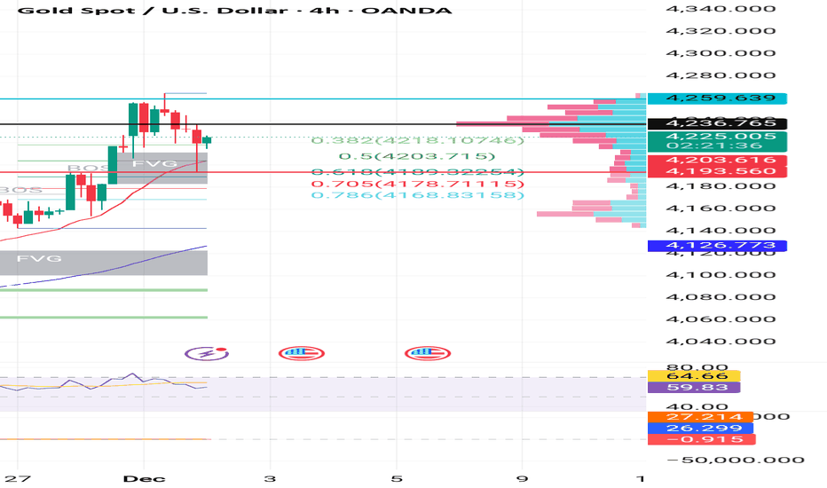 OANDA:XAUUSD Golden Liquidity Sweep & FVG Reversal Signal: BUY Entry: 4,203.560 TP1: 4,236.765 TP2: 4,259.639 TP3: 4,280.000 SL: 4,189.322 Insights: Price swept liquidity below 4,203.560 (red level) and tapped into the 0.618–0.705 Fibonacci zone, aligning with a Fair Value Gap (FVG) and high-volume node on VRVP. RSI is rebounding from midline (50), MACD histogram shows bullish momentum building, and price is above the 50-period MA. Market structure shows BOS to the upside, suggesting bullish continuation after liquidity grab. #FVGReversal #LiquiditySweep #GoldScalpingSetup#HighRR #SmartMoneyConcepts #BreakoutMomentum 🌟 Trade Like Hunter (for professional edge) ✅ High-Probability Setup: Confluence of FVG, BOS, VRVP support, RSI bounce, and MACD crossover 📊 Risk-Reward Ratio: Approx. 1:2.5 to TP2, 1:4 to TP3 🔑 Liquidity Zone Confirmation: Entry aligns with swept liquidity and imbalance zone 🧠 Market Psychology: Accumulation phase post-sweep, breakout momentum expected ⚡ Probability Score: 80% High Probability 📈 Scalability: Setup aligns across H1 and H4 timeframes... Read more -