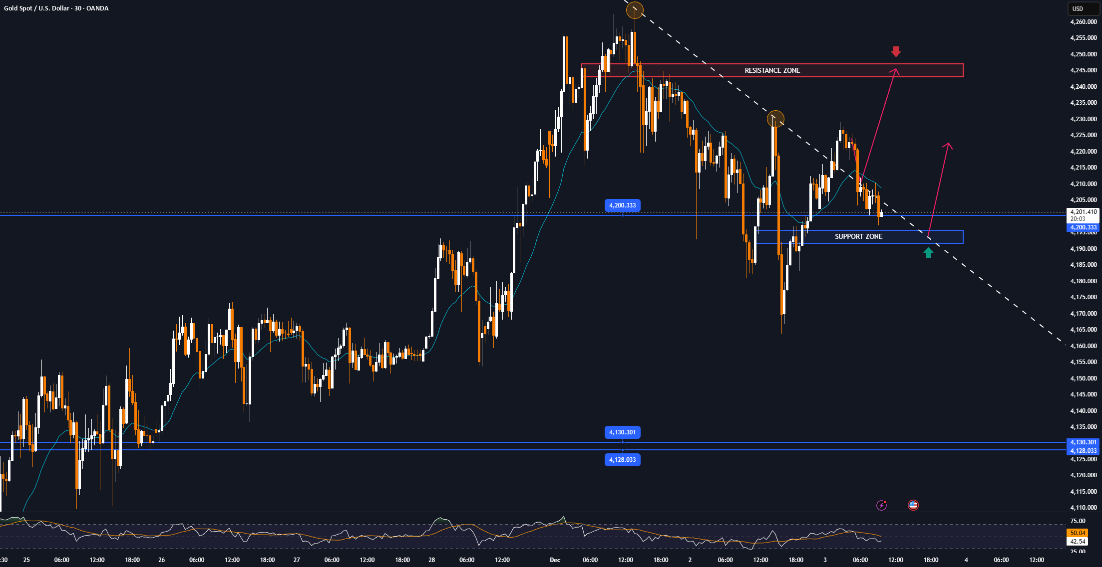 Spot OANDA:XAUUSD closed nearly flat at $4,203.06 an ounce, down less than 0.1%, after a volatile session in New York. A significantly weaker-than-expected ADP report sent gold soaring to $4,241.60 an ounce, before profit-taking pressure and a sharp reversal in silver sent prices quickly tumbling back to $4,195 an ounce. As of writing today, Thursday, December 4, spot gold was trading at $4,202 an ounce, up about $10 on the day. ADP data showed the US private sector lost 32,000 jobs in November, in stark contrast to expectations for a gain of 10,000, the sharpest decline since March 2023. Win Thin (Nassau 1982) assessed that the ADP index had weakened continuously, reflecting a sustained downward trend in the labor market. Nela Richardson (ADP) noted the widespread slowdown across all business groups, especially the small and medium-sized sector, a sign of more cautious consumers in the context of macro instability. While... Read more -