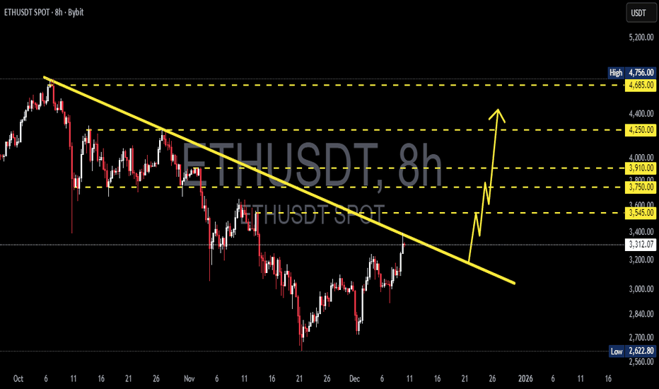 ETH is now sitting at the most crucial level of Q4 — directly attacking the descending trendline that has rejected every rally since early October. This is not just a trendline. This is the wall separating ETH from a full momentum breakout. --- 🔍 What’s Really Happening on the Chart? ETH has formed a sequence of higher lows, showing growing buyer strength. The descending trendline (yellow) remains the final defense for the bears. Several major resistance zones above (3,545 → 3,750 → 3,910 → 4,250 → 4,685) are aligned perfectly if a breakout confirms. Price is now sitting at a decision zone, and markets often expand aggressively after setups like this. In simple terms: ETH is preparing for a big move — only the direction is yet to be chosen. --- 🔥 Bullish Scenario — A Breakout That Changes Everything If ETH manages to: 1. Close an 8H candle above... Read more -