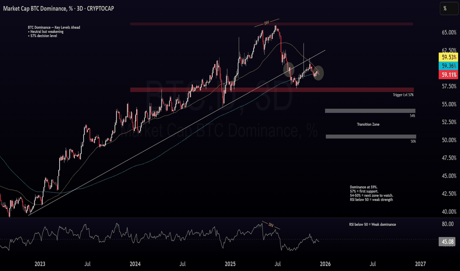 CRYPTOCAP:BTC.D •BTC dominance is sitting around 59% — steady for now, but without strong momentum behind it. •With the RSI holding below 50, the overall strength looks like it’s fading gradually. •The previous trendline break is still valid, and it suggests the market may be shifting its behavior. •The 57% level is the key point to watch - any test there could tell us a lot about the next direction. •If dominance breaks below 57% with a clean close, that could mark the start of a corrective move. •The zone between 54% and 50% remains important - historically, this area has acted as a transition zone in market cycles. Important now : •How price reacts around 57% •Whether RSI continues to stay below 50 •If dominance starts drifting toward the 54%–50% zone (Current structure leans weak — but the key decision level is 57%. Above that level, the outlook remains... Read more -