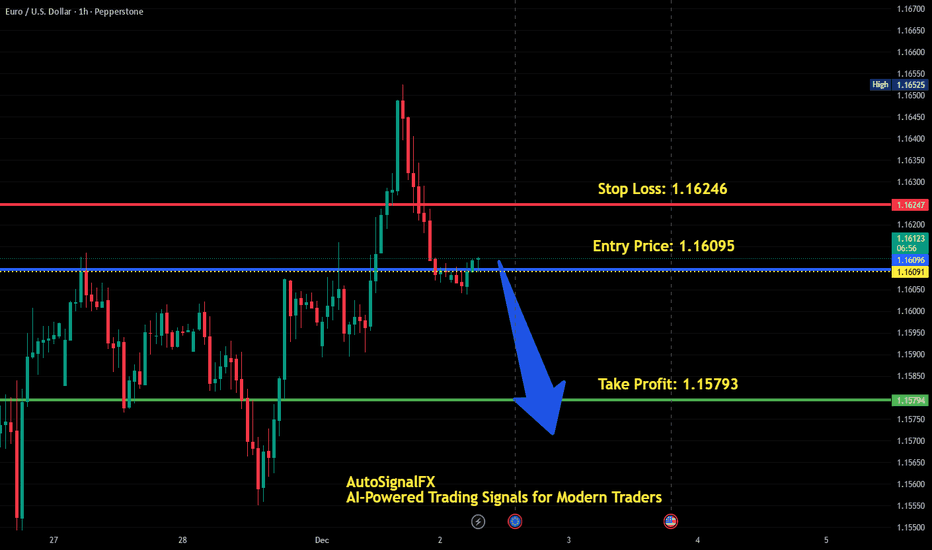 Institutional Technical Breakdown | All Sessions EUR/USD has generated a SELL signal based on the Fibonacci Retracement model, with price now reacting from a key Fib retracement zone that aligns with intraday resistance. Combined with weakening momentum and bearish divergence, the pair is showing strong signs of downward continuation. This setup remains entirely technical, with no high-impact fundamental events distorting price action. 📌 Signal Summary Bias: SELL Model: Fibonacci Retracement Sessions: All Sessions Risk/Reward: ~1:2.5 Market Environment: High liquidity, stable volatility The algorithm identifies that EUR/USD has retraced into a strong Fib resistance cluster, setting up a clean reversal opportunity. 📊 Technical Outlook 1. Fibonacci Confluence Zone Price is currently reacting from the Fib retracement zone that aligns with: 38.2% to 50% retracement of the recent swing Intraday resistance around 1.16125 – 1.16155 This creates a layered confluence zone, a common institutional sell area where liquidity is engineered before reversal.... Read more -
