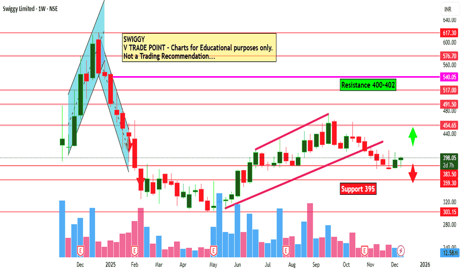 Swiggy Ltd for 10th Dec #SWIGGY Resistance 400-402 Watching above 403 for upside momentum. Support area 395 Below 400 gnoring upside momentum for intraday Watching below 395 for downside movement... Above 400 ignoring downside move for intraday Charts for Educational purposes only. Please follow strict stop loss and risk reward if you follow the level. Thanks, V Trade Point... Read more -