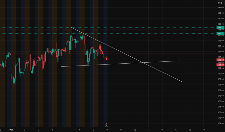 SPY is sitting right on top of the same demand block that has been holding since Dec 2–3. Price keeps tapping this zone but hasn’t broken it with conviction. Each test is getting weaker — candles are getting smaller, buyers are not pushing away like before, and liquidity keeps building underneath. We can see the descending trendline on the 1H chart pressing SPY lower. Every bounce keeps getting sold earlier, showing clear compression. The whole structure is getting tight, and compression near support usually leads to an expansion move. If SPY loses 682–681, that’s the clean break of this multi-day floor. https://www.tradingview.com/x/styPwrF8/ On the 15M chart, CHoCH after CHoCH around the same zone shows constant attempts to flip bullish, but none of them are sticking. That’s typically distribution above a key level — not accumulation. The BOS that mattered (Dec 9 morning) was followed by a failure to continue up.... Read more -