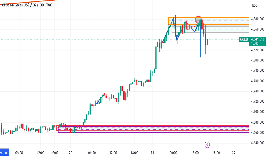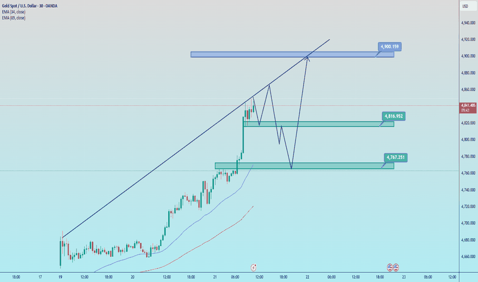 1️⃣ Trendline Main trend: BULLISH Price remains above the ascending trendline → the Higher High – Higher Low structure is still valid. The current move is a consolidation / technical pullback, with no signs of a structural breakdown yet. 2️⃣ Resistance 4,900 – 4,905: Strong resistance (target peak + confluence with the upper trendline) → profit-taking pressure is likely. Condition for continuation: A clear break and close above 4,900. 3️⃣ Support 4,816 – 4,814: Near-term support (consolidation / pullback zone). 4,766 – 4,768: Strong support (Higher Low + demand zone). Holding above this area keeps the bullish trend intact. 4️⃣ Main Scenario Priority: BUY with the trend as long as price holds above 4,768, target 4,900. Warning: A break below 4,766 increases the risk of a deeper correction and requires close price action monitoring. Trading Plan BUY GOLD: 4,816 – 4,814 Stop Loss: 4,804 Take Profit: 100 – 300 –... Read more -