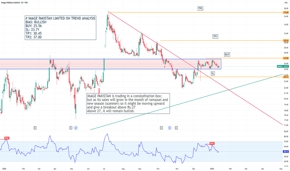 Bias: Bullish IMAGE Pakistan is currently trading inside a consolidation box while holding above a rising long-term trendline, indicating accumulation rather than distribution. Price has successfully absorbed selling pressure after a prolonged downtrend and is now compressing near resistance, suggesting breakout potential. Key Technical Observations: Price is respecting the ascending trendline, keeping the higher-low structure intact. The previous descending trendline has been broken, shifting momentum in favor of buyers. Consolidation near Rs. 27 reflects supply absorption. RSI is hovering around the neutral zone (~50), showing balance with upside room. Seasonal demand (Ramzan / summer textile sales) supports a fundamental tailwind. Trade Plan: Buy Zone: Around 25.56 (trendline + range support) Stop Loss: 23.71 (below trendline & structure low) Target 1: 30.45 (range breakout objective) Target 2: 37.00 (previous major supply zone) Invalidation: A daily close below 23.71 would weaken the bullish structure and negate the setup. Conclusion: This is a... Read more -