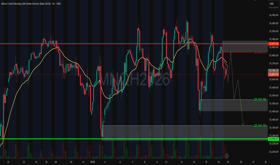 Following a sharp rejection at higher-timeframe resistance, NQ sold off aggressively and is now consolidating. Price has broken below the prior consolidation low and lost its internal support trendline, suggesting distribution rather than accumulation. If weakness persists, price may continue lower into the start of the week, potentially grabbing liquidity before a reaction bounce toward prior supply near 25,820.25. Failure there could open the door for a move toward 25,526.50, with an extension risk to 25,363.75. Higher timeframes remain range-bound since the Oct high and Nov low, keeping rallies suspect until supply is reclaimed. Scenario-based analysis... Read more -