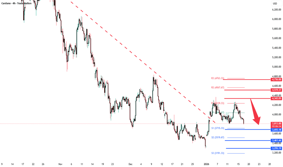 The ADAUSD pair continues to display a bearish outlook, in line with the prevailing downward trend. Recent price action suggests a corrective pullback, potentially setting up for another move lower if resistance holds. Key Level: 4,336 This zone, previously a consolidation area, now acts as a significant resistance level. A failed test and rejection at 4,336 would likely resume the bearish momentum. Downside targets include: 3,700 – Initial support 3,450 – Intermediate support 3,270 – Longer-term support level Bullish Scenario (breakout above 4,520): A confirmed breakout and daily close above 4,520 would invalidate the bearish setup. In that case, potential upside resistance levels are: 4,520 – First resistance 4,736 – Further upside target Conclusion ADAUSD remains under bearish pressure, with the 4,520 level acting as a key inflection point. As long as the price remains below this level, the bias favours further downside. Traders should watch for price confirmation around... Read more -