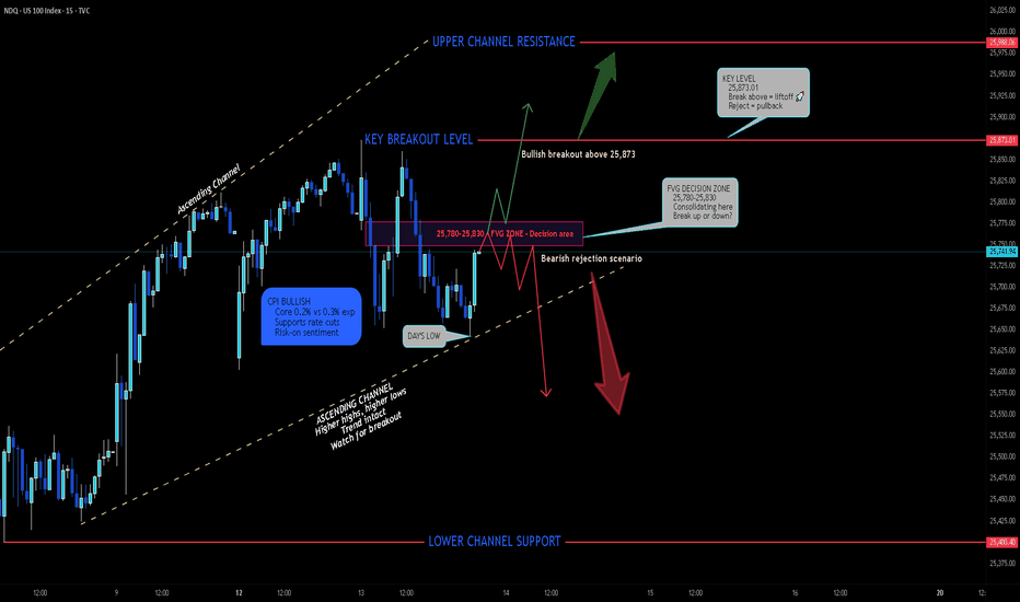 Hey TradingView! NASDAQ 100 is at a critical decision point right now. Let me break down what I'm seeing on the 15-minute chart. The Setup NDQ is trading at 25,741 inside an ascending channel, currently consolidating in the FVG zone around 25,780-25,830. Price keeps pushing up, pulling back into the FVG, then bouncing - classic accumulation pattern. The key level is 25,873.01. Break above that = liftoff. Reject = back down to test lower supports. Why This Level Matters Ascending channel intact - higher highs, higher lows FVG zone acting as decision zone - price consolidating here 25,873.01 is the KEY resistance - break above = bullish continuation CPI came in cooler than expected - supports Fed rate cut narrative S&P 500 and Dow at record highs - NASDAQ lagging slightly Intel and AMD upgraded by KeyBanc - chip sector bullish The News Context Mixed but leaning bullish: Core CPI... Read more -