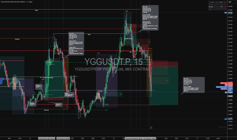 https://www.tradingview.com/x/HjxOeTPQ/ Sell-Side Trade — YGGUSDT.P (15m) Pair: YGGUSDT Bias: Sell-side Date: Fri 16th Jan 2026 Session: London Session AM Time: 10:15 am (UK) Entry TF: 15-minute 🎯 Execution Levels Entry: 0.07067 Take Profit: 0.06853 (3.02%) Stop Loss: 0.07093 (0.36%) Risk–Reward: RR 8.23 Sentiment & Session Context Price expanded into premium during the London session before failing to hold above prior highs. Rejection from internal FVGs and a clean break in short-term structure confirmed distribution. London AM provided the sell-side displacement, with price targeting inefficiencies and sell-side liquidity resting below. Bias Going Forward Valid while: Price remains below the London highs / premium PD array Invalidation: Acceptance back above 0.07093 with displacement Expectation: Continued mean reversion into sell-side liquidity... Read more -
