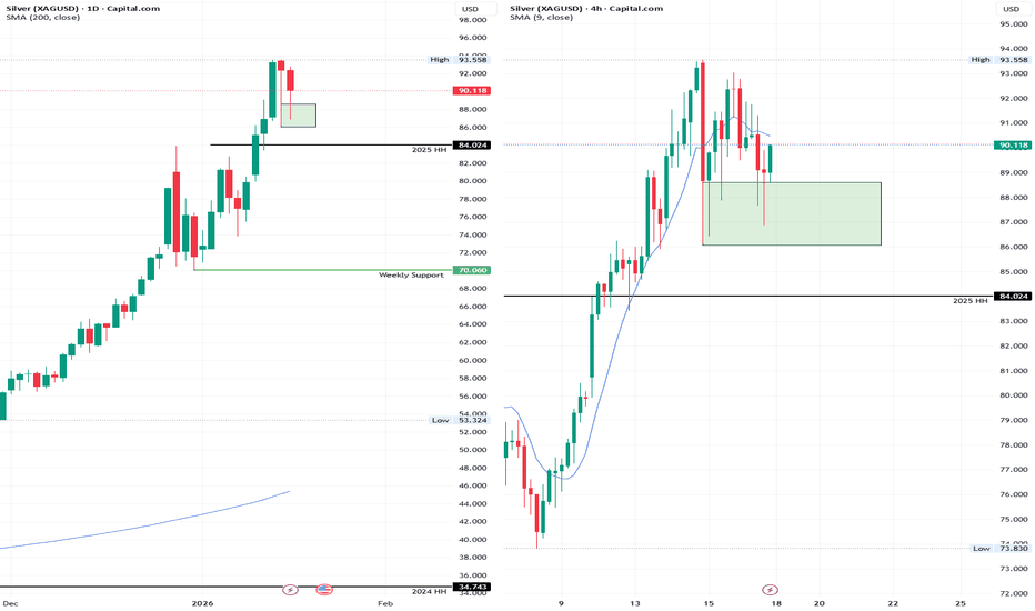 Quick breakdown on Silver using the Daily and 4H charts. On the weekly timeframe, Silver is still overall bullish. Structurally nothing has changed, and there’s no major news or technical signs suggesting a full trend reversal yet. On the daily chart, price recently tapped into a fair value gap and we saw a strong reaction from that area. That push back up tells me buyers are still active and defending key levels. Dropping down to the 4H chart, we ended last week with a strong run into the close. That momentum going into the weekend usually tells me continuation is possible — but I’m still waiting patiently for my setup. Ideally, I’d like to see a pullback into the 86–88 zone on the 4H. If price comes back into that area and gives me confirmation, I’d consider looking for a long. If it doesn’t? I’m completely okay with missing the... Read more