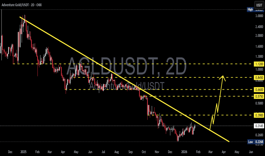 AGLD/USDT remains in a long-term downtrend, characterized by a clear sequence of lower highs and lower lows since its peak. However, recent price action shows weakening bearish momentum and early signs of a consolidation phase after a prolonged decline. --- Pattern & Price Structure Price continues to move below the main descending trendline (yellow line), which has acted as a dynamic resistance since the beginning of the downtrend. The current structure resembles a Descending Channel / Extended Downtrend with Base Formation. At the lower area, price compression is visible as the range tightens, indicating the potential for a strong directional move ahead. As long as price remains below the descending trendline, the broader structure is still technically bearish. --- Key Levels (Support & Resistance) Resistance: 0.390 → nearest resistance and previous rejection zone 0.575 → mid-term resistance and former distribution area 0.660 – 0.845 → strong supply zone 1.120 →... Read more -