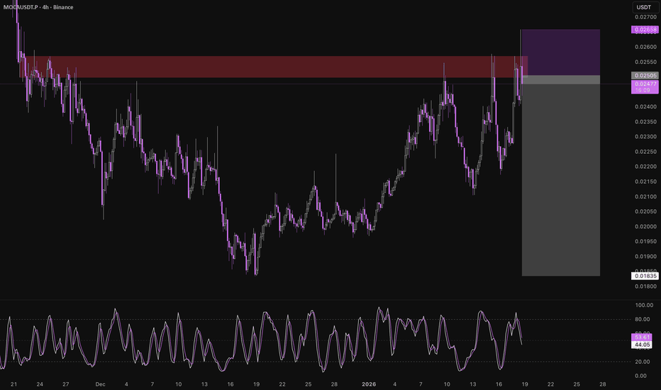 On the BINANCE:MOCAUSDT.P 4H chart, price has rallied back into a major supply zone (red), which previously acted as a strong distribution area. This is the area where I expect sellers to step in again. I’m looking to short the rejection from this zone rather than chase the move higher. Entry is planned on clear bearish confirmation inside the supply (rejection wick, bearish engulfing, or a lower-high / structure shift). Invalidation is a clean acceptance above the supply zone (sustained closes above the red area). If rejection holds, the downside target is a mean reversion back toward the prior range / lower liquidity area. Trade Plan: Direction: SELL / Short Entry: Rejection confirmation inside the red supply zone Stop: Above the supply zone highs Target: Drop back into the range (toward lower support / liquidity)... Read more -