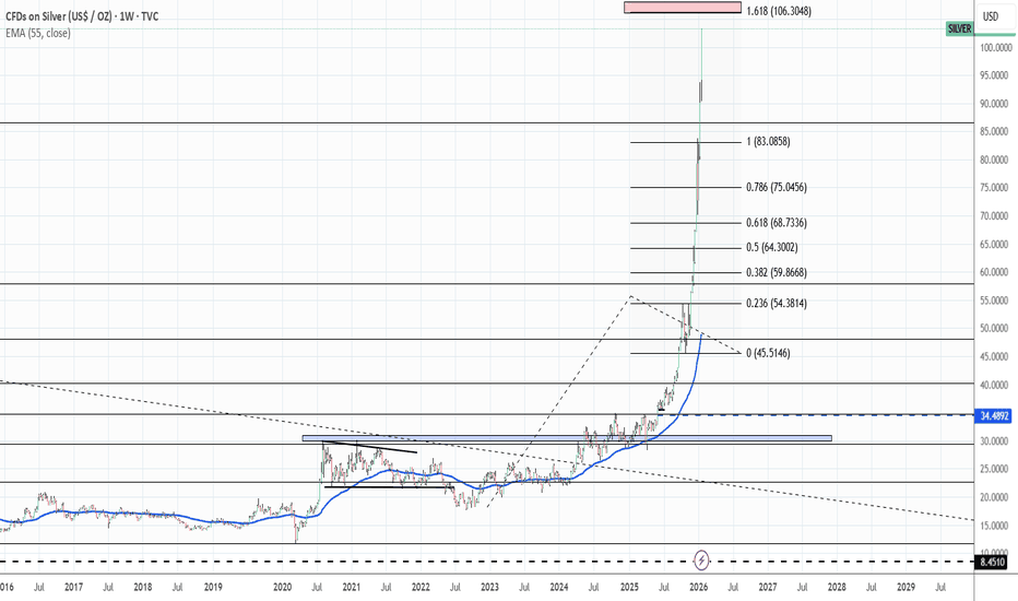 G'day, thanks for viewing. Possibly a longer timeframe trade than most are considering. I entered silver at $34 and change planning on exiting at a gold to silver ratio of 45:1 or better. If you look back at my 2025 post - entry and exit are clearly defined. Well, it was a good trade. Now looking to exit. Not seeing any weakness in gold. May be seeing some bearish RSI divergence in silver. Fib extension hints at an upside target being above USD106/oz. Do, I try to maximise my gains or just take my 180%+ gain and be happy? Will sell half my silver position ay USD106/oz and buy Perth Mint Gold ETF (management fee 0.15% and deposits guaranteed by WA govt). Then will see if I get a little better / or not than that in the following weeks. I put the previous silver bull markets at 24 weeks... Read more -