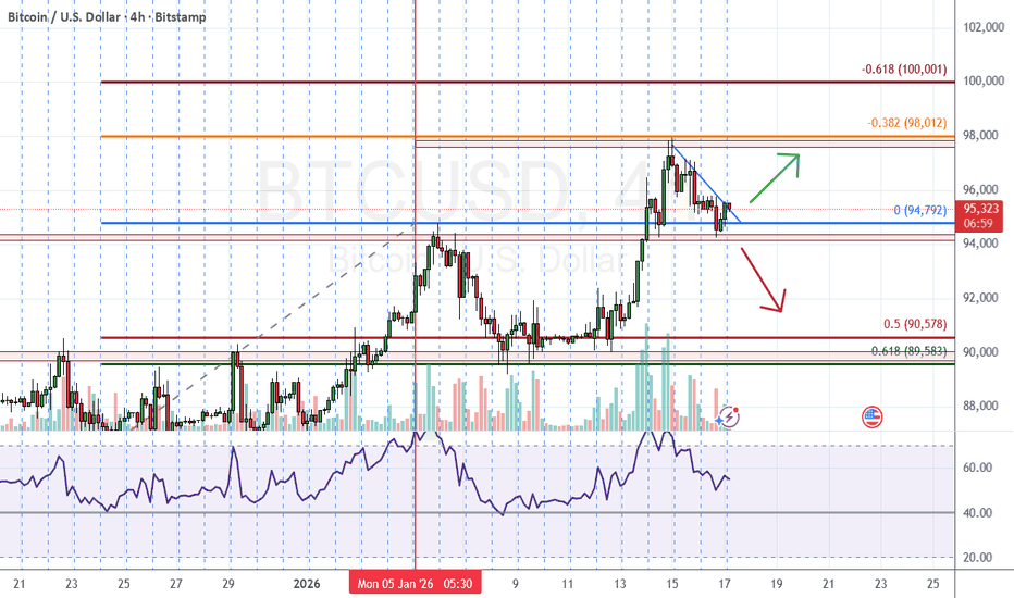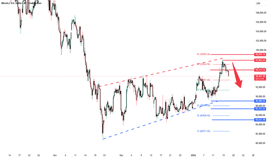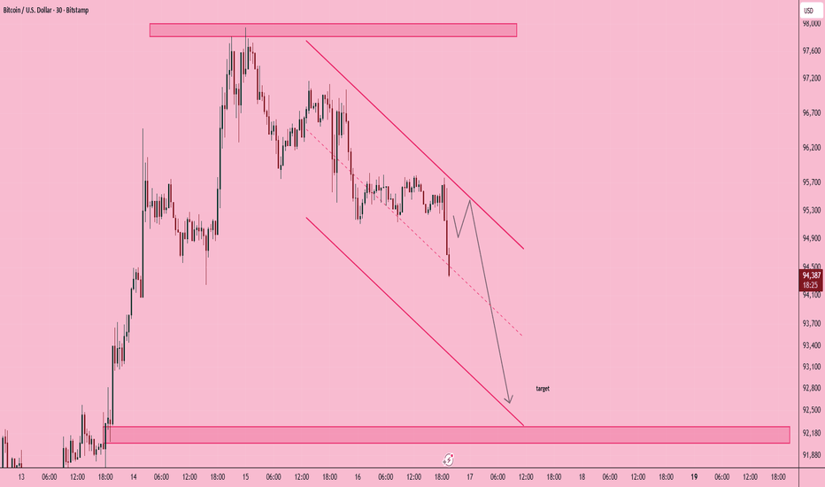 BITSTAMP:BTCUSD After failing to sustain above the premium supply area, price transitioned into a controlled bearish phase. Current consolidation near mid-channel reflects weak bullish response, suggesting distribution rather than accumulation. Momentum favors continuation toward lower liquidity. Key Scenarios ❌ Bearish Case 📉 (Primary) Rejection from channel resistance keeps downside pressure intact. 🎯 Target 1: 93,800 🎯 Target 2: 93,200 🎯 Target 3: 92,200 – Major Demand / Liquidity Zone ✅ Bullish Invalidation 🚀 A strong close and acceptance above 96,400 – 96,600 would invalidate the bearish structure and neutralize this setup. Current Levels to Watch Resistance 🔴: 95,800 – 96,300 Support 🟢: 93,500 → 92,200 ⚠️ Disclaimer: This analysis is for educational purposes only. It is not financial advice.... Read more