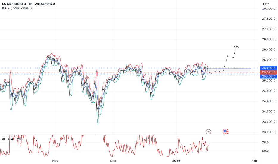 Nasdaq might be completing the consolidation phase before making another leg up. Technical and financial sectors were lagging behind other sectors (basic materials, industrial, energy sectors), but should the bull market continue, the rotation of sectors might start and drive Nasdaq from the trading range as shown at the chart. The market is entering the earnings season, and many big tech companies were in a drawdown (AAPL, NVDA, PLTR) dragging the Nasdaq down. If the buying activity will get back to techs, we might observe another round of buying for the US tech sector. Don't forget - this is just the idea, always do your own research and never forget to manage your risk!... Read more -