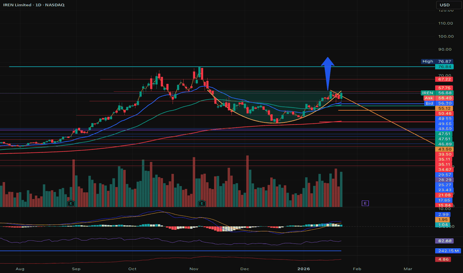 Earning Date was updated and IREN popped back up to re-test YTD High. Considerations: 1. End of the day got a Double Top rejection right below < $59 but it is holding $50 pretty well until now. 2. A Descending Resistance from last Week's High was beautifully broken which can work as a Descending Support from now. 3. Breaking down below < 50 can trigger a sell off down to $43-$47 area. Bouncing on the newly created Descending Support until the Earning Date has a clean permission to take the price at least at $45 which is NOT breaking the Cup&Handle pattern created since last mid-November 2025. Holding that price area with good earning result on February 05, 2026 can complete this pattern with a bullish upside of 85% ($45 - > $83.5). This is not a buy/sell advice, shared to back-test a pattern analysis with trends and sheds from... Read more -