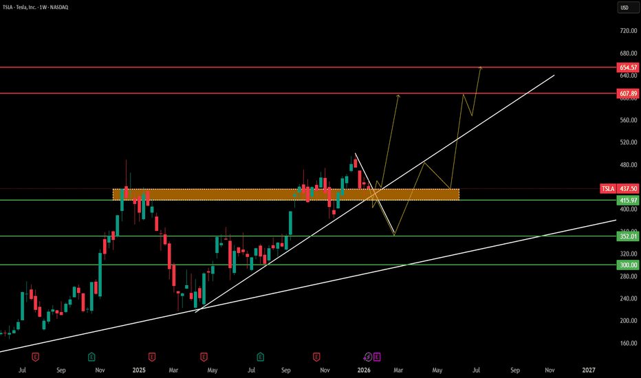There are 2 thesis here. Thesis 1: if the Tesla make good earnings this season there is a chance it could go to 600$ level from current level if that breaks the weekly down trend line by end of Jan 2026. Thesis 2: if Tesla fails to show good earnings. there is a chance the current weekly down trend will continue further to 350$ level to break the current down trend line and then it clears the path to 600$ level. Letsee how it goes. What you say? Good luck with trades and safe rides.!!... Read more -
