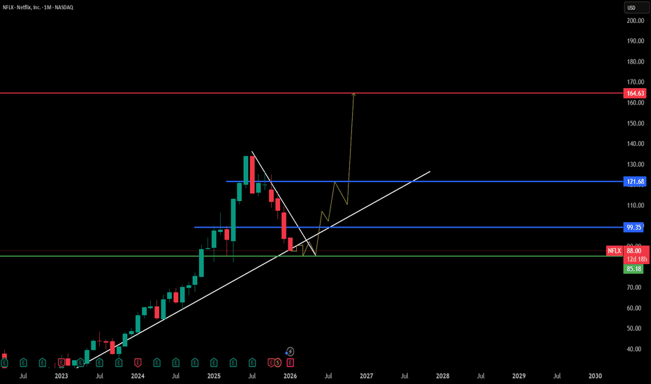 NFLX — from Deep Fib Retracement 85$ to 160$ NFLX completed a strong impulse move and has since pulled back into a deep Fibonacci retracement while still respecting the broader rising structure. Waiting on the Weekly down trend line to break. Also it is compressing after a deep retracement within a broader bullish structure. The chart favors continuation only upon confirmation. Until the reclaim happens, this remains a watchlist setup—not an active trade. Price retraced into the 0.236–0.382 Fib zone after the prior impulse. Rising trend structure remains intact. Current price is basing near structural support (~85–90 zone). This area acts as a decision zone: hold and reclaim → continuation; lose it → thesis invalidated. Support / Invalidation: ~85 A daily close below this level invalidates the bullish continuation thesis. Reclaim Zone (Trigger): 97–104 This is the critical area (Fib 0.236–0.382). Acceptance above this zone is required for upside continuation.... Read more -