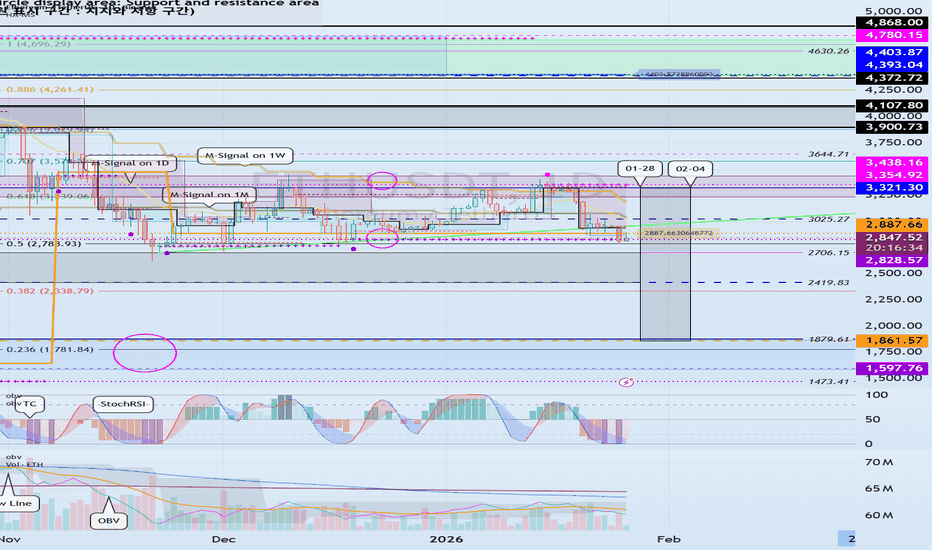 Hello, fellow traders. By "Following," you can always get the latest information quickly. Have a great day today. ------------------------------------- #ETHUSDT https://www.tradingview.com/x/CsOVQwQs/ We need to observe the price action from around January 28th to February 4th. The key is whether it can find support around the 2.828.57 to 2.887.66 range and rise above the uptrend line. If it fails to rise, we need to check for support around the 2.419.83 to 2.706.15 range. If the decline continues, the maximum decline is expected to be around the 1597.76 to 1861.57 range. - If it falls below the HA-Low indicator on the 1D chart, a stepwise downtrend is likely. Since the downtrend ends with an uptrend, trading to increase the coins (tokens) corresponding to the profits is possible. The basic trading strategy is to buy in the DOM(-60) ~ HA-Low range and sell in the HA-High ~ DOM(60) range. The time to stop... Read more -