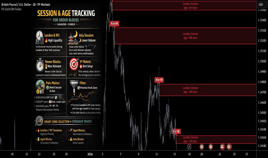 Latest version Order Block Finder | Gold | ProjectSyndicate labels all sessions automatically and assigns the order block age. Just enable it with ON from indicator settings. https://www.tradingview.com/script/cohxPlYw-Order-Block-Finder-Gold-ProjectSyndicate/ 🕒 Session context = understanding who is moving the market Session identification matters because institutional order flow changes a lot across the trading day. London and New York sessions typically bring the highest liquidity and volatility for XAUUSD and most major Forex pairs, because that’s when big banks, funds, and macro players are most active. Order blocks formed during these sessions often reflect real institutional positioning and tend to react more cleanly when price revisits them. 🇦🇸 Asian session order blocks can be lighter weight During the Asian session, volume is often thinner—especially for Gold (XAUUSD) and many GBP/EUR crosses—so order blocks created there can be easier to invalidate and sometimes form from smaller liquidity runs. That said, Asian session blocks can... Read more -